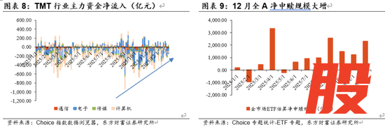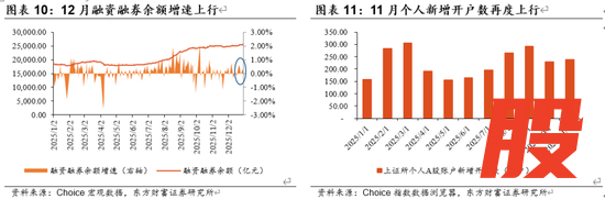 资金面,机构和杠杆资金的边际增量入场迹象明显,居民存款搬家可能是重要增量。以TMT为代表的机构重仓板块主力资金净流出减缓,显示机构持仓信心坚挺,而ETF成为本轮行情重要的增量资金来源。2025年12月以来,中证A500ETF等核心宽基品种持续获得大额申购,全市场ETF净申赎规模大增,为市场带来了稳定的流动性支撑。另外,杠杆资金近期与机构资金形成共振,12月融资融券余额增速上行,反映出市场整体风险偏好正在修复。居民端,尽管年末居民取现需求可能出现季节性提升,但A股上证所个人新增开户数自10月低点以来再度上扬,存款搬家的边际增加可能是近期抢跑春季行情的重要增量。最后,险资与社保资金方面受“开门红”配置需求驱动,长线资金入市步伐可能加快,我们认为这一趋势短期内不会改变。