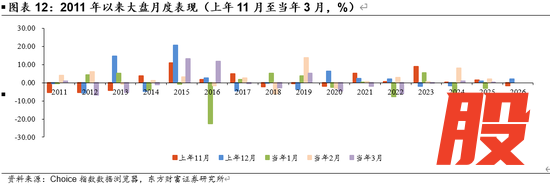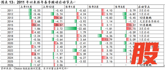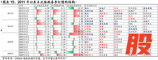 回顾A股历史上春季躁动的经验,2011年以后“春季躁动”在Q1如期开展并非板上钉钉。在16次样本中,共9次正常在当年Q1启动,3次无显著春季行情,4次在上年11或12月提前启动。这4次抢跑春季行情分别是2013年春季行情于上年12月抢跑;2015年春季行情于上年11月抢跑;2025年相对特殊,春季行情于“924行情”抢跑后大盘高位震荡,并未出现大涨大跌;最后一次即今年,2026年春季行情于上年12月抢跑。
