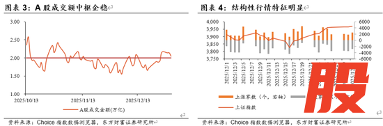 从市场情绪看,跨年临近并未压制交投热度,12月中旬以来成交额中枢持续上行,元旦节前4个交易日A股成交额稳定在2万亿元以上,且结构行情演绎比较极致:12月中旬以来多次出现下跌个股多于上涨个股、但指数表现强劲的现象,反映资金更倾向于集中在少数线索与高弹性方向。