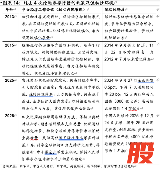 4次春季行情提前启动的共性催化以政策预期升温与流动性宽松为主。政策方面,核心在于中央经济工作会议等会议释放明确的信号。流动性方面,过往4次抢跑春季行情由央行通过降准降息、公开市场净投放、创新流动性工具等操作精准配合政策导向,为市场提供充裕资金供给。政策与流动性的共振往往强化经济复苏或产业升级预期,吸引增量资金加速流入,推动行情在跨年阶段提前展开。
